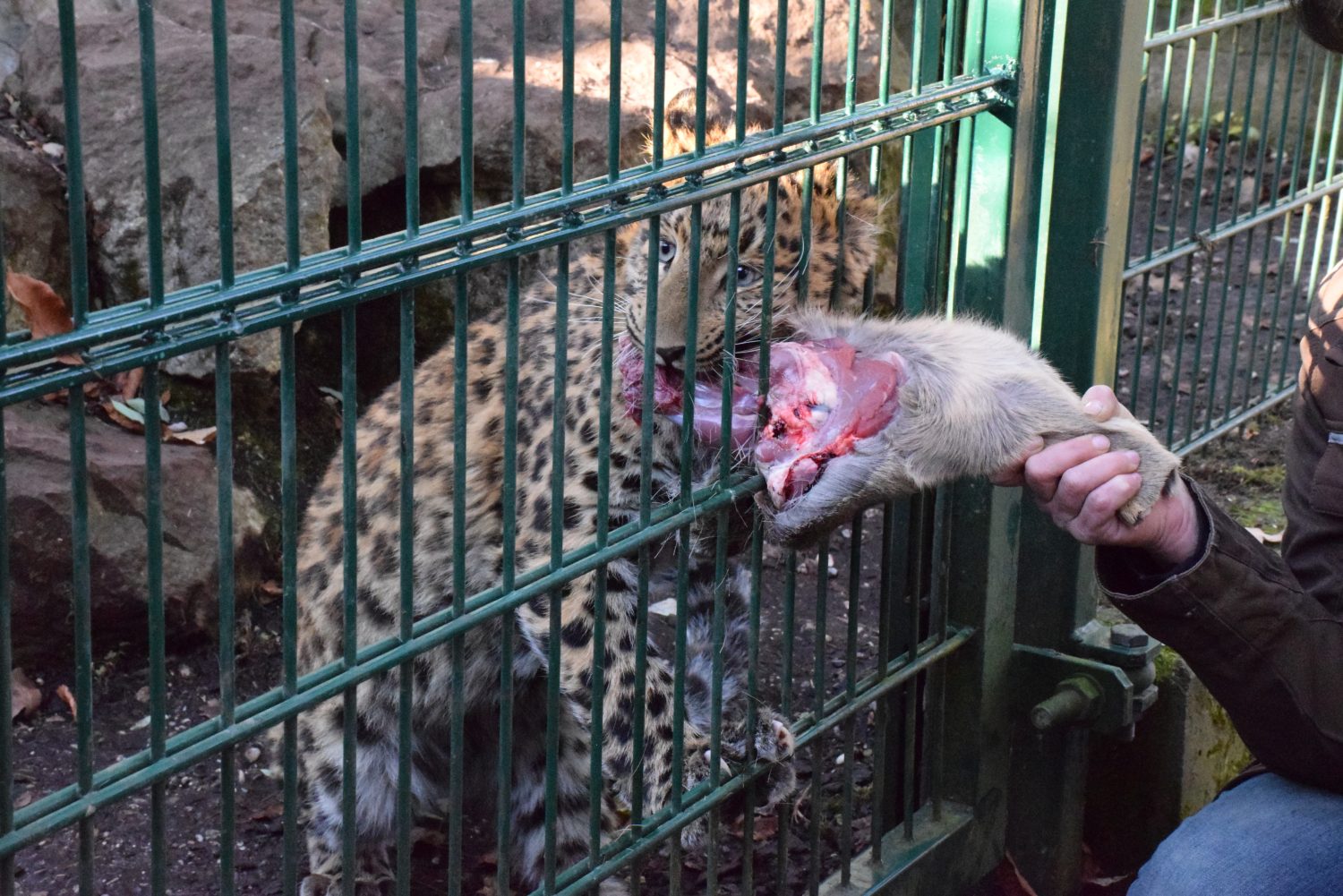 Bei der Namensgebungsfeier ermöglichte Tierpflegerin Elke dem Namensgeber und seiner Familie die Fütterung der Leoparden aus allernächster Nähe miterleben zu können. Die Gäste waren schwer beeindruckt.