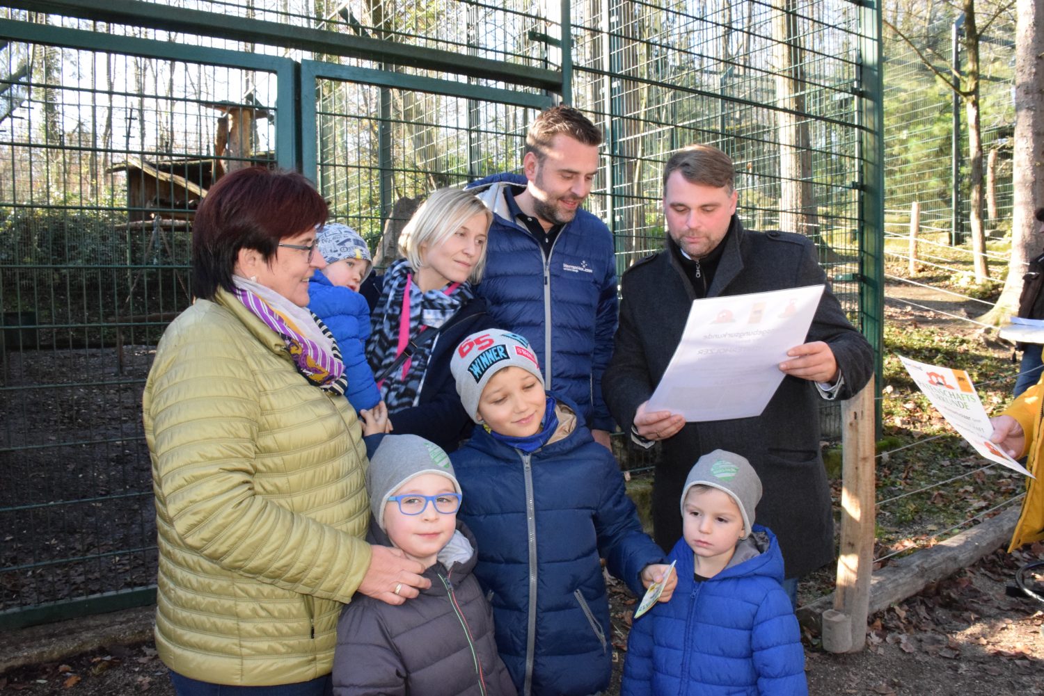 Bürgermeister und Geschäftsführer Lukas Michlmayr und Tierpark-Stadtrat Hans Kogler übernahmen die ehrenvolle Aufgabe dem Firmenchef, Ing. Christoph Hinterholzer die Namensgebungsurkunde, lautend auf „Odilia“, und die Patenschaftsurkunde zu überreichen.