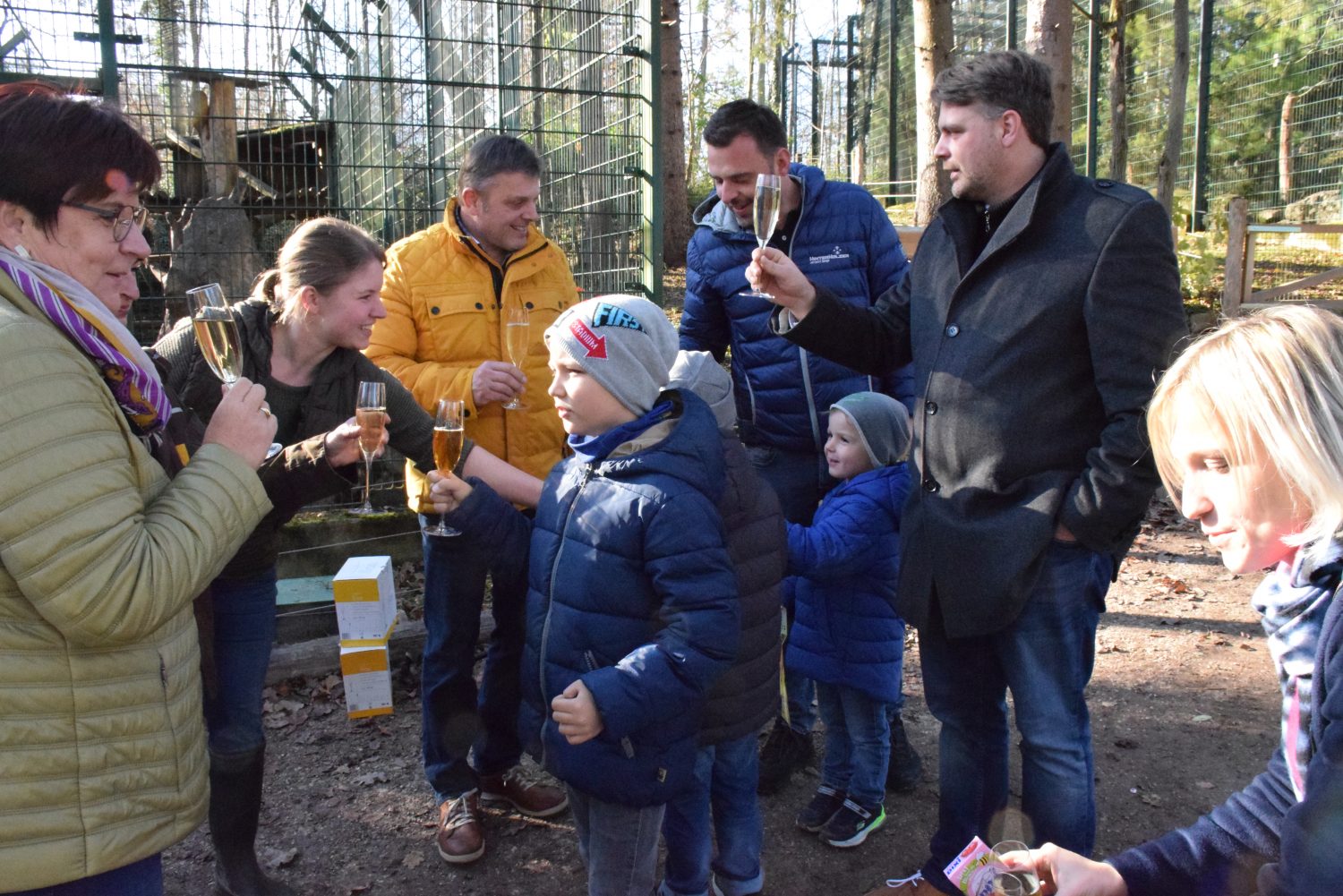 Nach der Veröffentlichung dieser Tafel am Zaun der Leoparden ließen die Gäste und die Vertreter des Tierparks die Leopardin „Odilia“ hochleben.